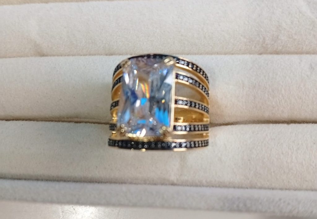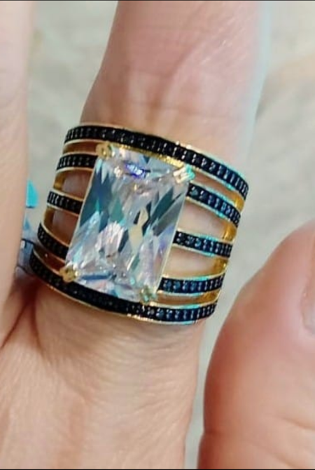 Anel Powerstone, folheado a ouro 18K, com pedra quadrada de zircônia e cravejado com micro zircônias negras. (cópia)
