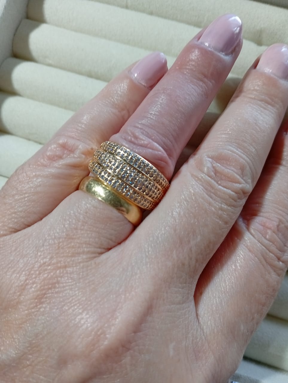 Anel Triumph, três aros folheado a ouro 18K, cravejado com micro zircônias, ARO N.20.