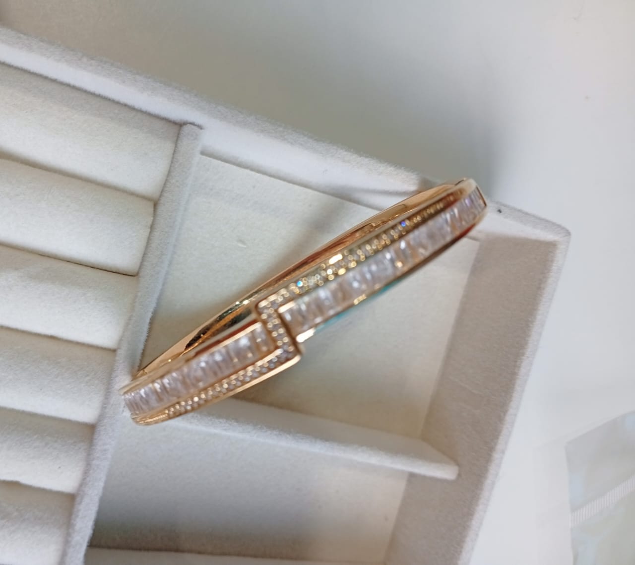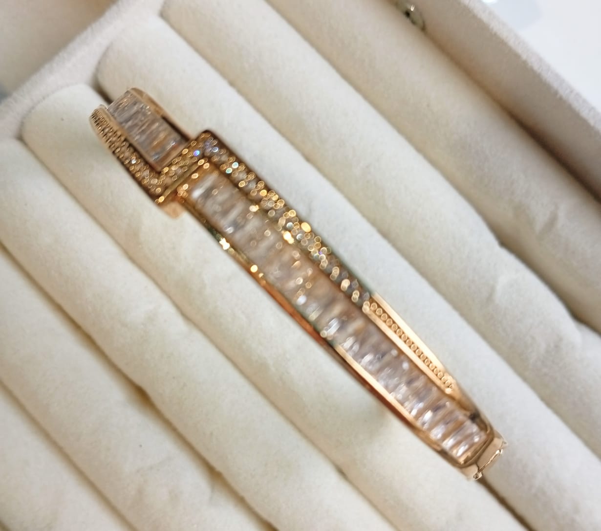 Bracelete cravejado com micro zircônias e zircônias baguetes, folheado a ouro 18K.