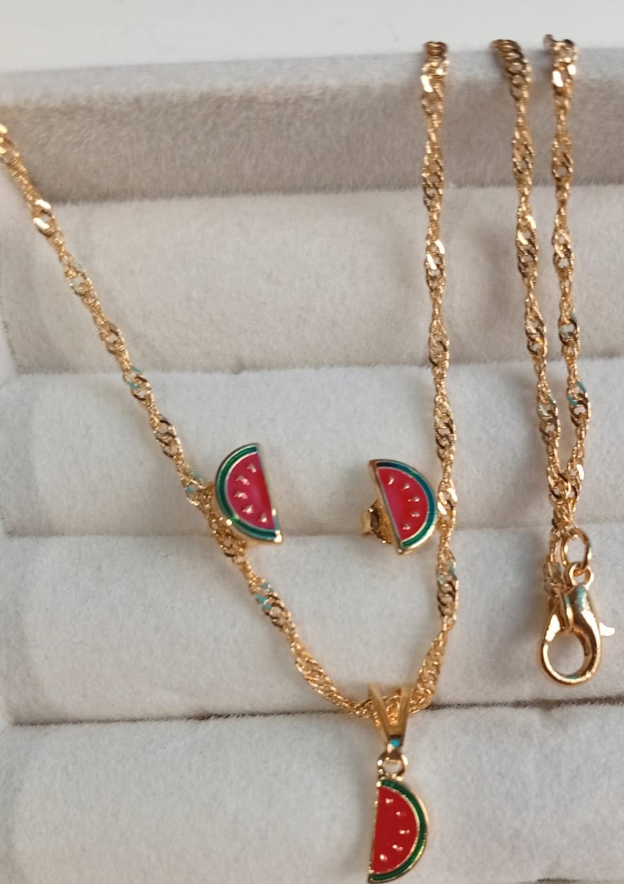 - Conjunto Infantil Brilho da Melancia, folheados a ouro 18K. (BRINCOS + CORRENTE Singapura + PINGENTE)